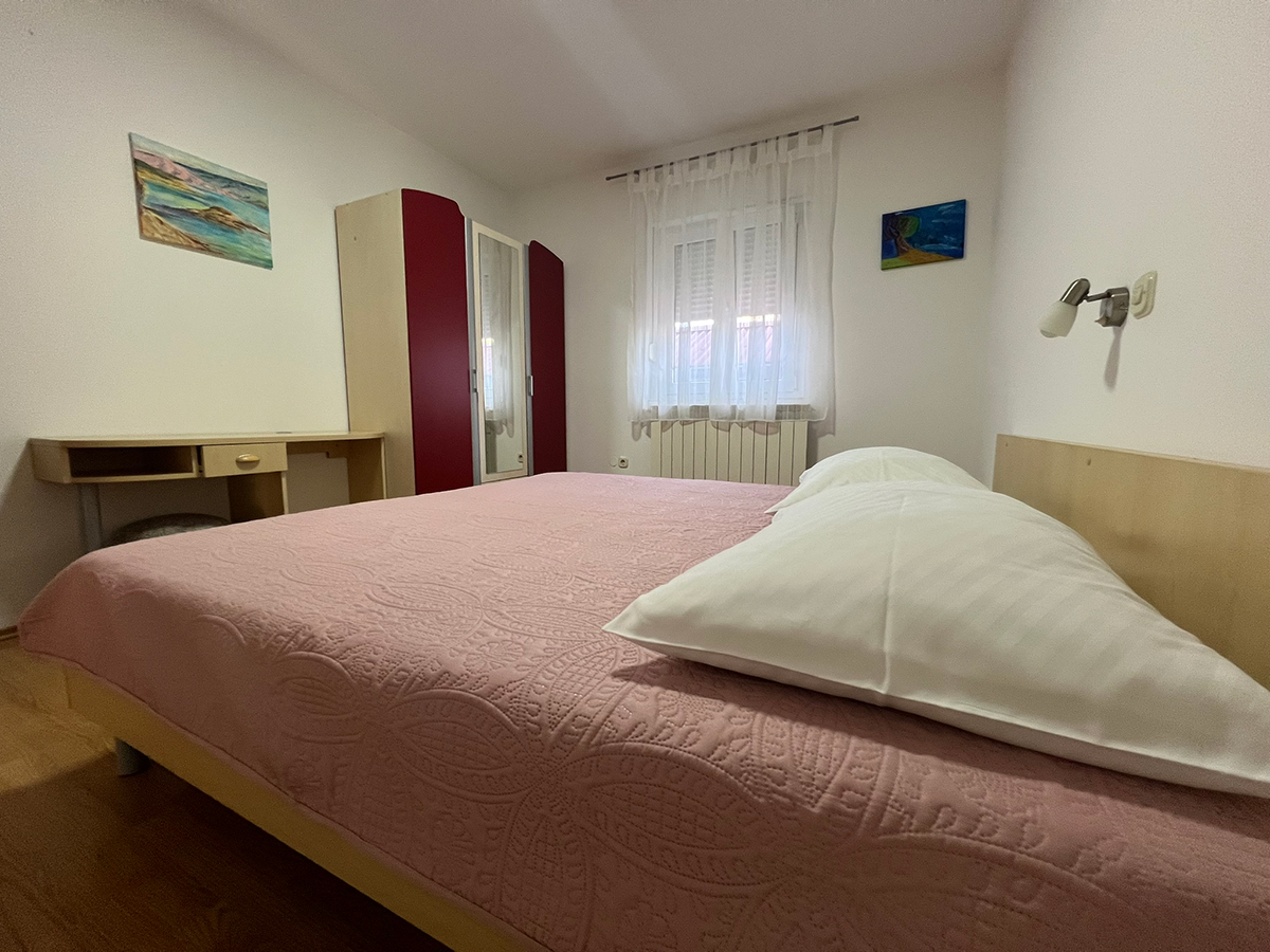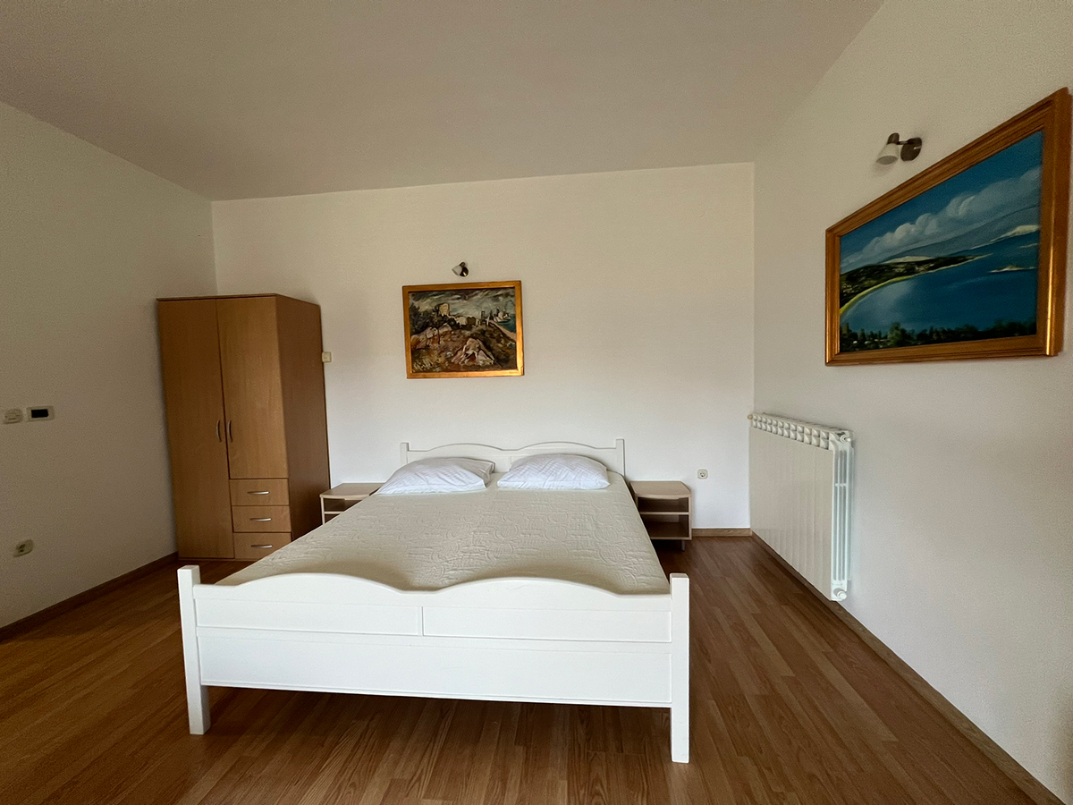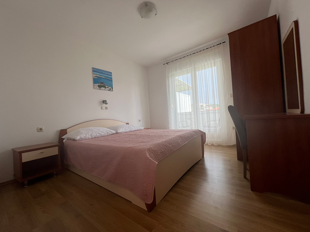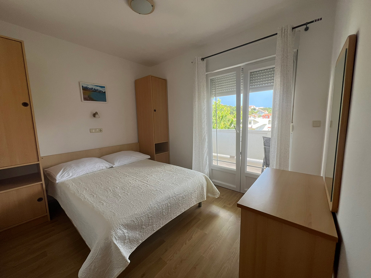 Obiteljski apartmanApartman se nalazi na prvom katu kuće. Ima jednu spavaću sobu koja može smjestiti dvije osobe, kupaonicu te potpuno opremljenu kuhinju u sklopu s dnevnim boravkom (štednjak, hladnjak, mikrovalna pećnica, kuhalo za vodu, aparat za filter kavu i ostali kuhinjski pribor). Apartman ima čak dva balkona za uživanje u pogledu na more. Apartman je klimatiziran, ima besplatan Wifi i satelitsku TV.