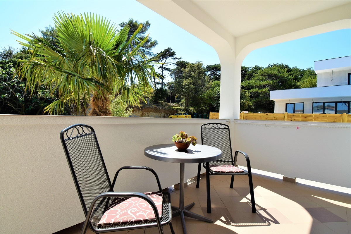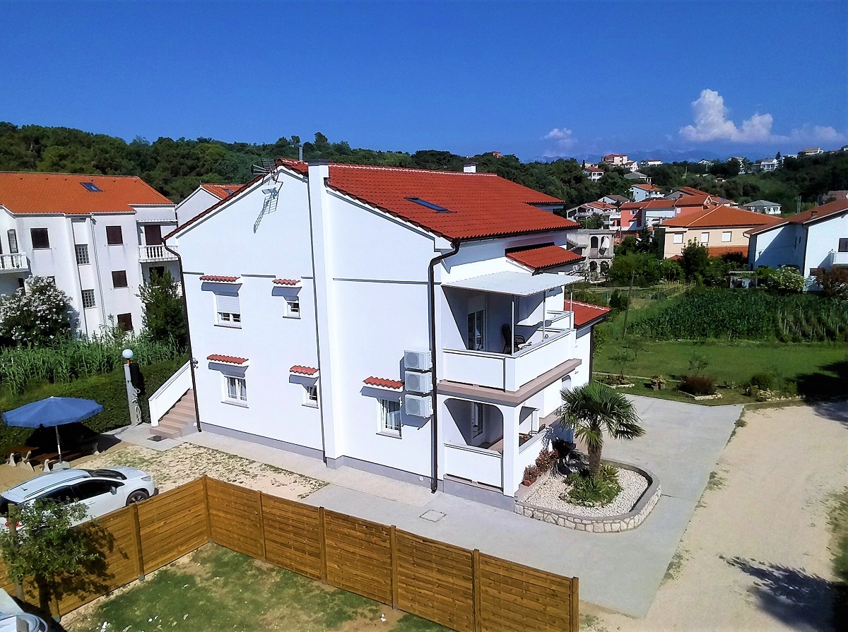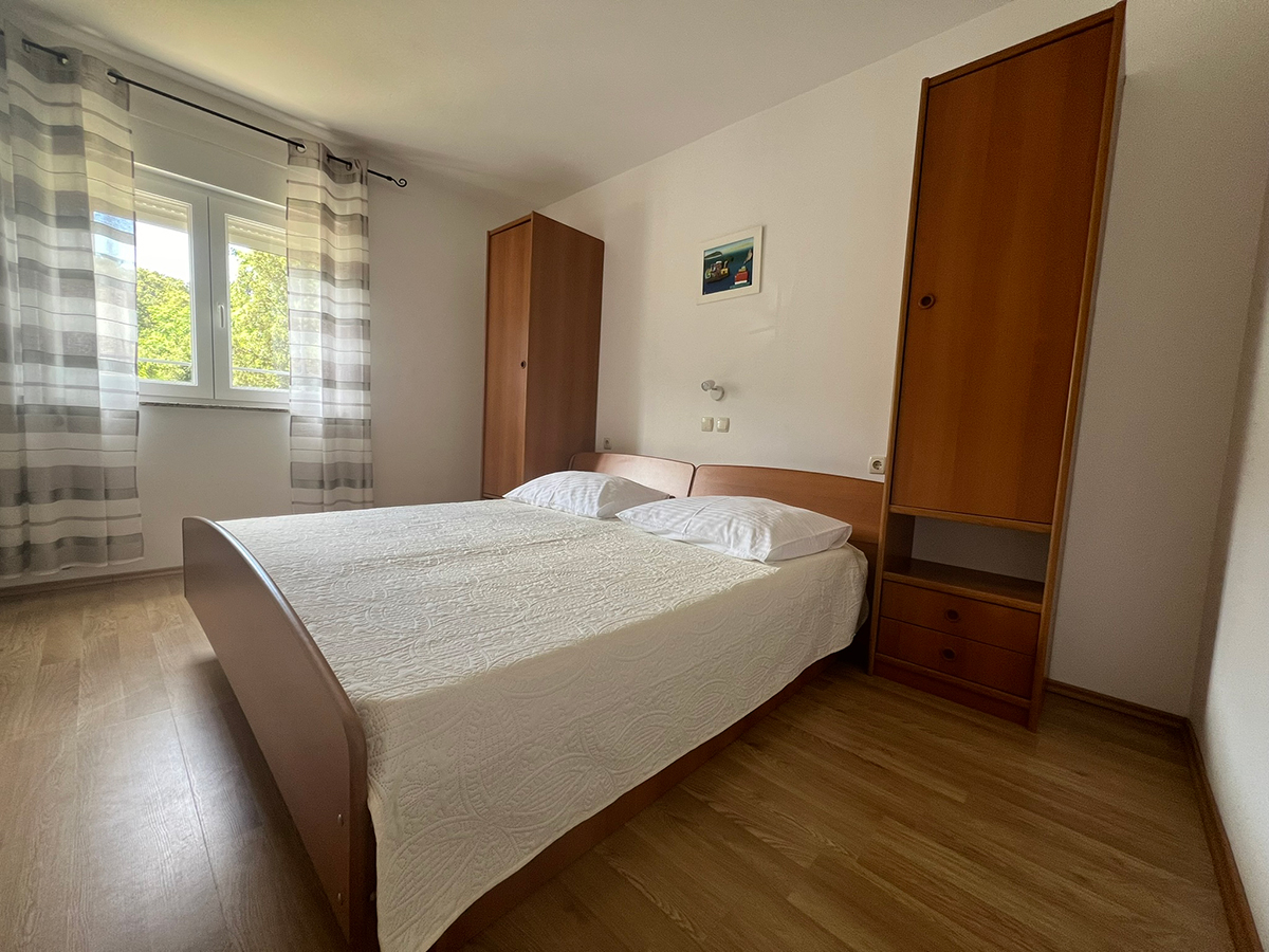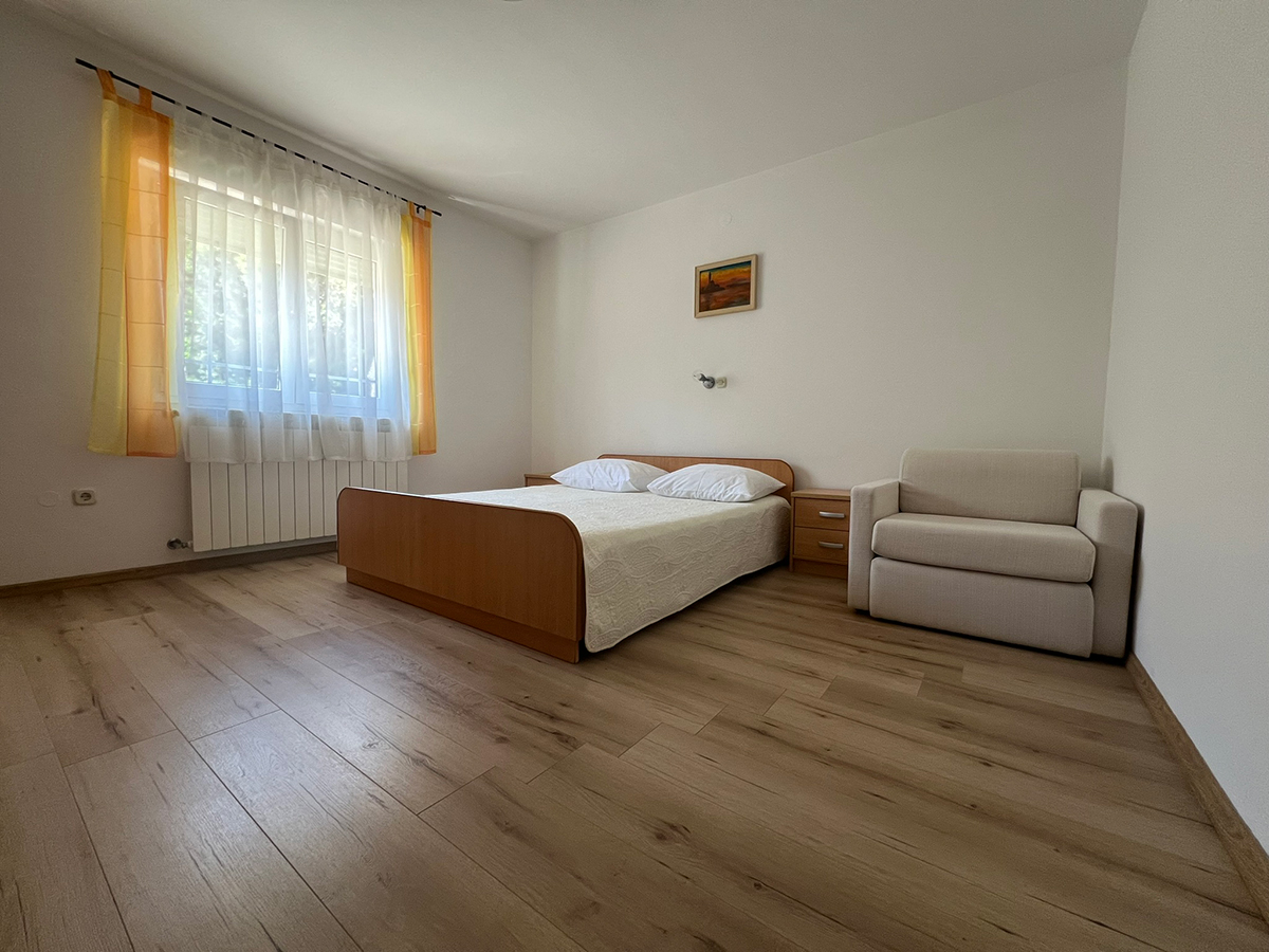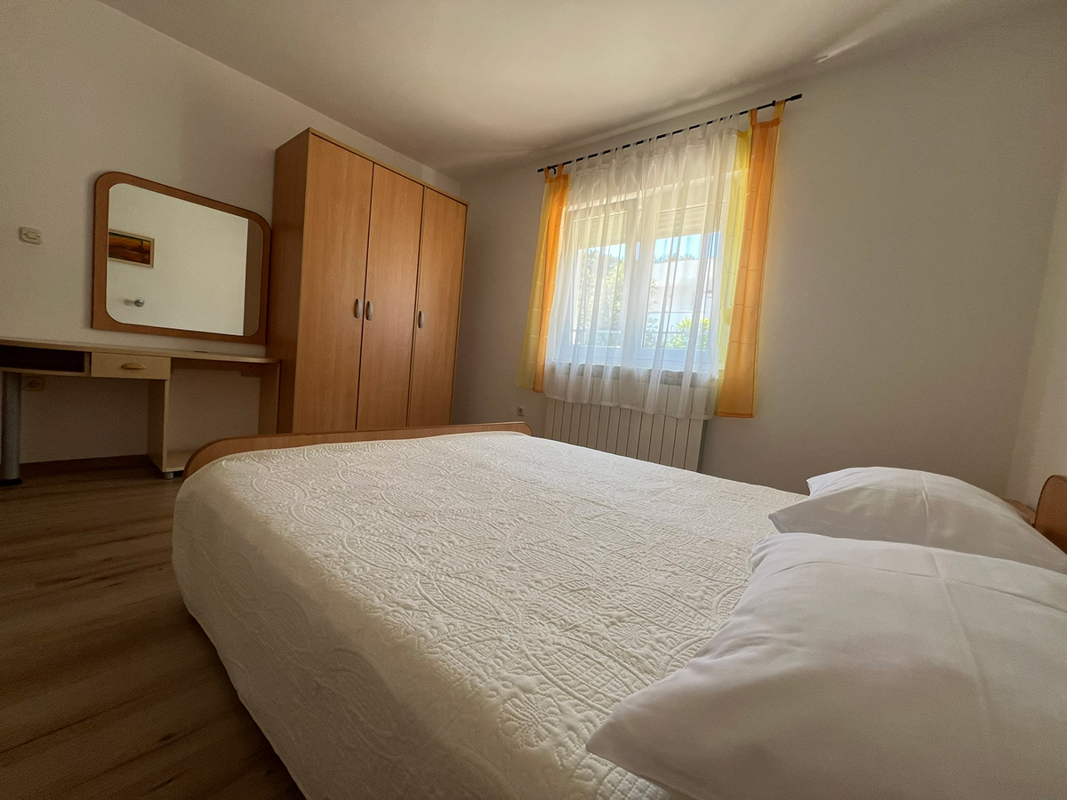 Obiteljski apartmanApartman se nalazi na prvom katu kuće. Ima jednu spavaću sobu koja može smjestiti dvije osobe, kupaonicu te potpuno opremljenu kuhinju u sklopu s dnevnim boravkom (štednjak, hladnjak, mikrovalna pećnica, kuhalo za vodu, aparat za filter kavu i ostali kuhinjski pribor). Apartman ima čak dva balkona za uživanje u pogledu na more. Apartman je klimatiziran, ima besplatan Wifi i satelitsku TV.