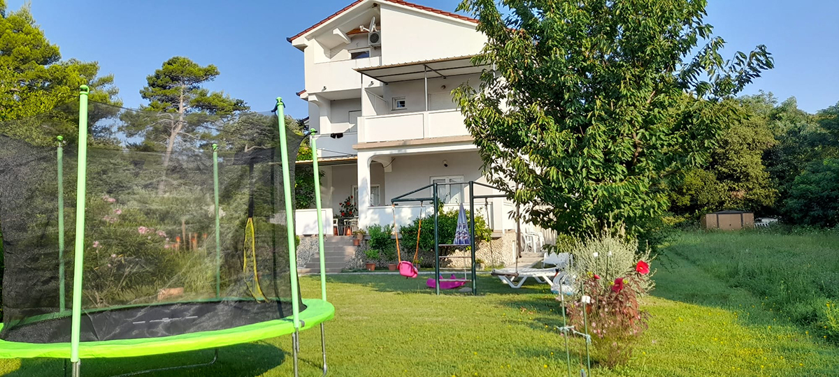 Obiteljski apartmanApartman 2 se nalazi u prizemlju kuće sa prostranim balkonom i pogledom na more. Jedna soba sa bračnim krevetom može smjestiti dvije osobe, a u apartmanu se nalazi u kupaonica te kuhinja i dnevni boravak (električni štednjak, pećnica, hladnjak, mikrovalna pećnica, kuhalo za vodu, aparat za filter kavu i ostali potrebni pribor). Apartman je klimatiziran, ima satelitsku tv i besplatan pristup internetu. Sa velikog balkona slobodno možete pristupiti vrtu na kojem se nalazi dječje igralište!